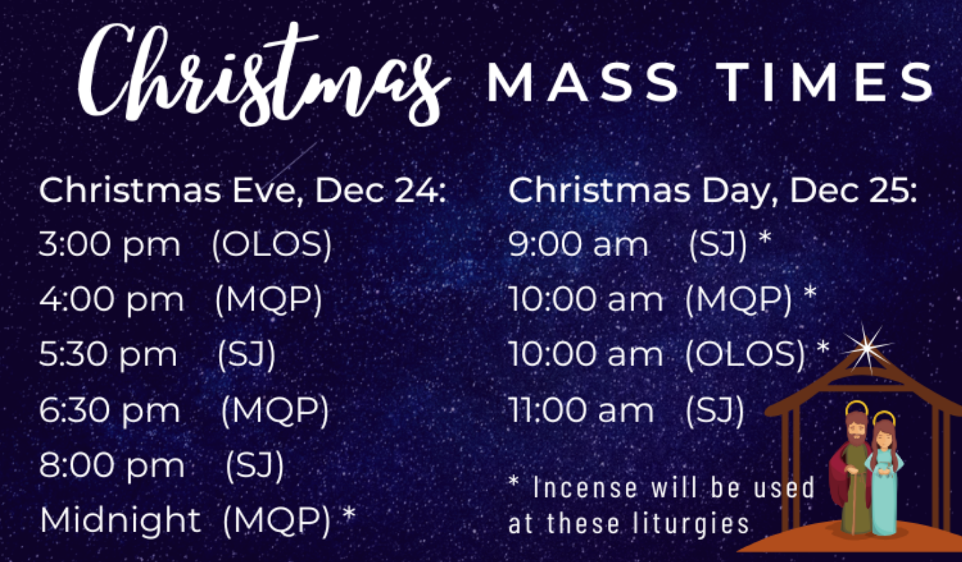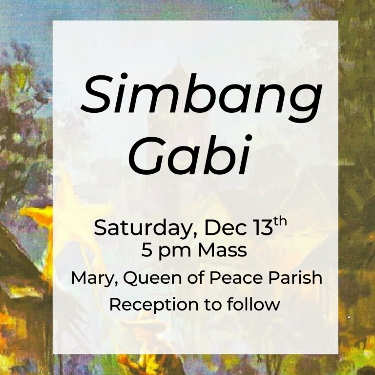 Join the Filipino community on Saturday, December 13th at the 5pm Vigil Mass at Mary, Queen of Peace to celebrate Simbang Gabi. Head to the Marian Social Hall after Mass for an evening of faith, fun, and Filipino food! Hosted by the Filipino Community and Mary, Queen of Peace, Our Lady of Sorrows and St. Joseph Parishes. Support our ministry events by donating through this link.